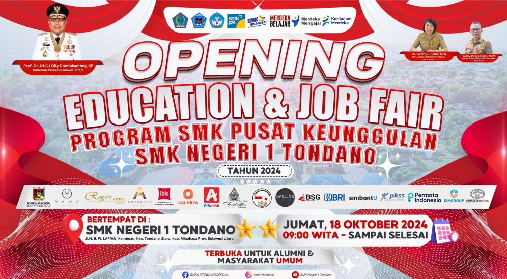 Berkarier langsung setelah lulus? Bisa banget! SMK Negeri 1 Tondano akan mengadakan Opening Education & Job Fair pada Jumat, 18 Oktober 2024, pukul 09.00 WITA. Ajang ini akan mempertemukan siswa dengan berbagai perusahaan terkemuka. Selain itu, akan ada berbagai kegiatan menarik lainnya. Catat tanggalnya dan ajak teman-temanmu! #SMKPK #JobFair #Tondano